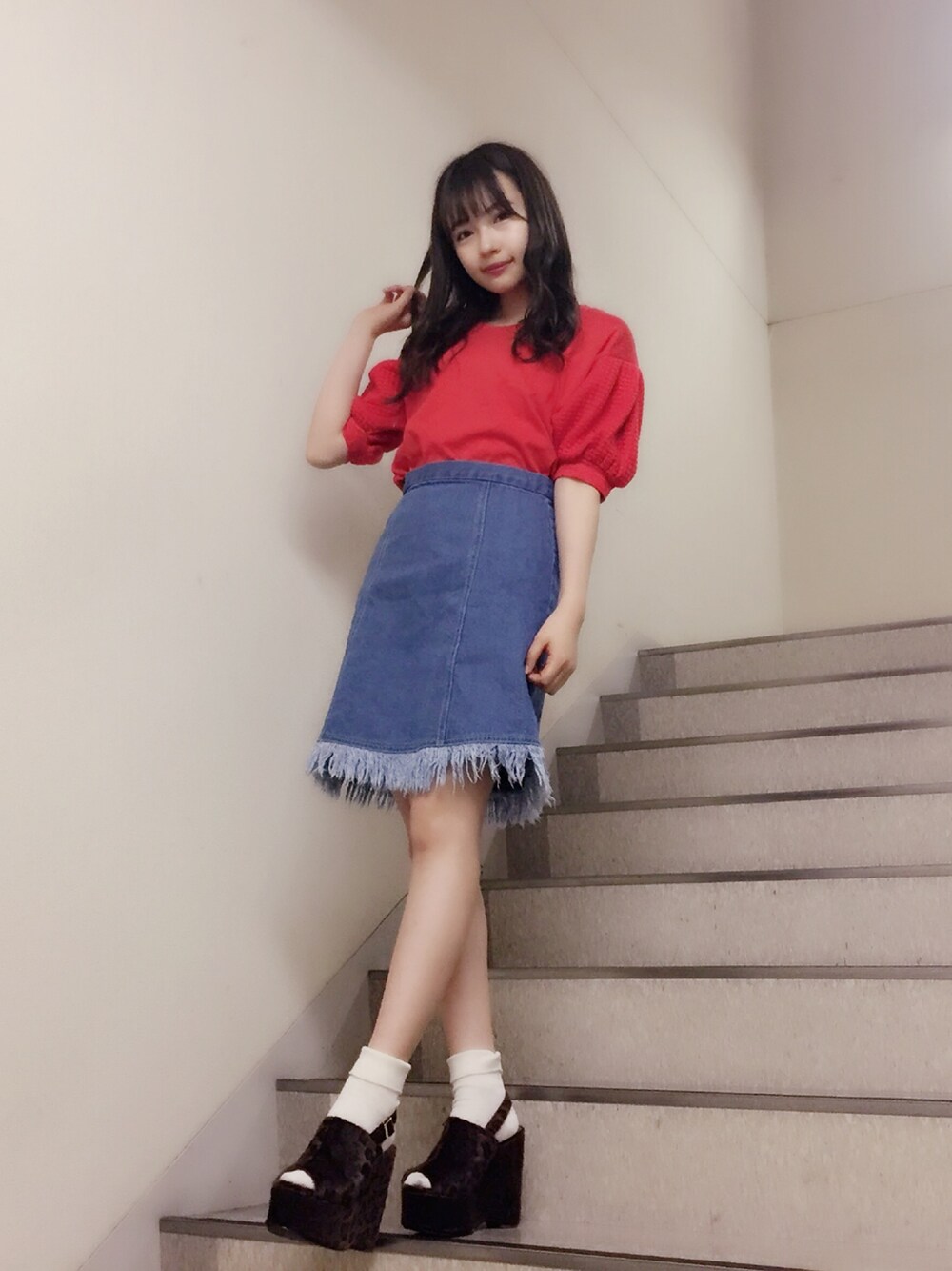 ウォッチありがとうございます❤️ 私服👗✨ 赤のパフスリーブ♡^_^ フリンジデニムのスカートと合わて パキッとした赤と デニムの青で明るくhappyな印象に🌈 膝上のボトムには 高めのヒールを合わせると 全体のバランスか良くなります❤️