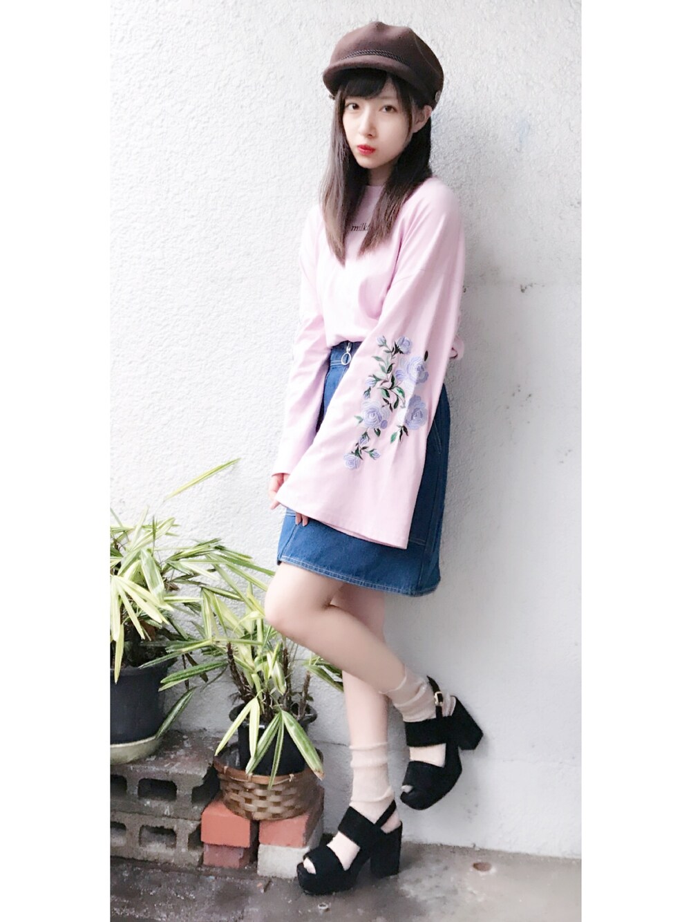 ウォッチありがとうございます♡ 私服👗✨ ふんわり丸いキャスケット(^ ^) 袖がワイドで刺繍がポイントの milkfed.のトップス💓💓 デニムスカートと合わせて トップスが目立つコーディネートに😊😊