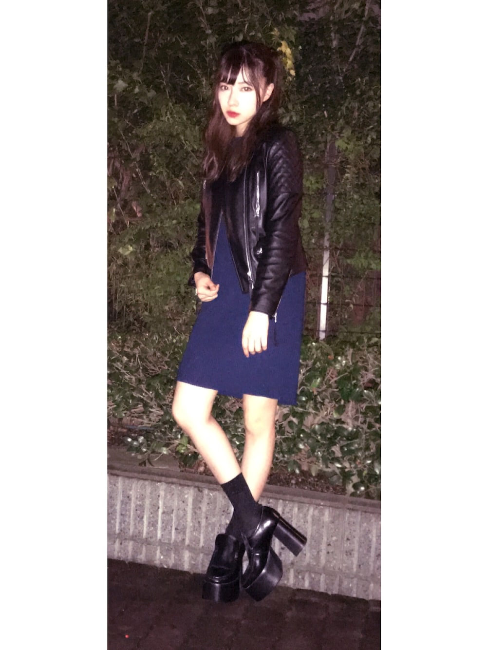 ウォッチありがとうございます😊 私服👗✨ タイトワンピに ライダースを合わせた 辛口コーデ💜❤️ ブラック×ブルーに ワンピースのラインが映えます♡