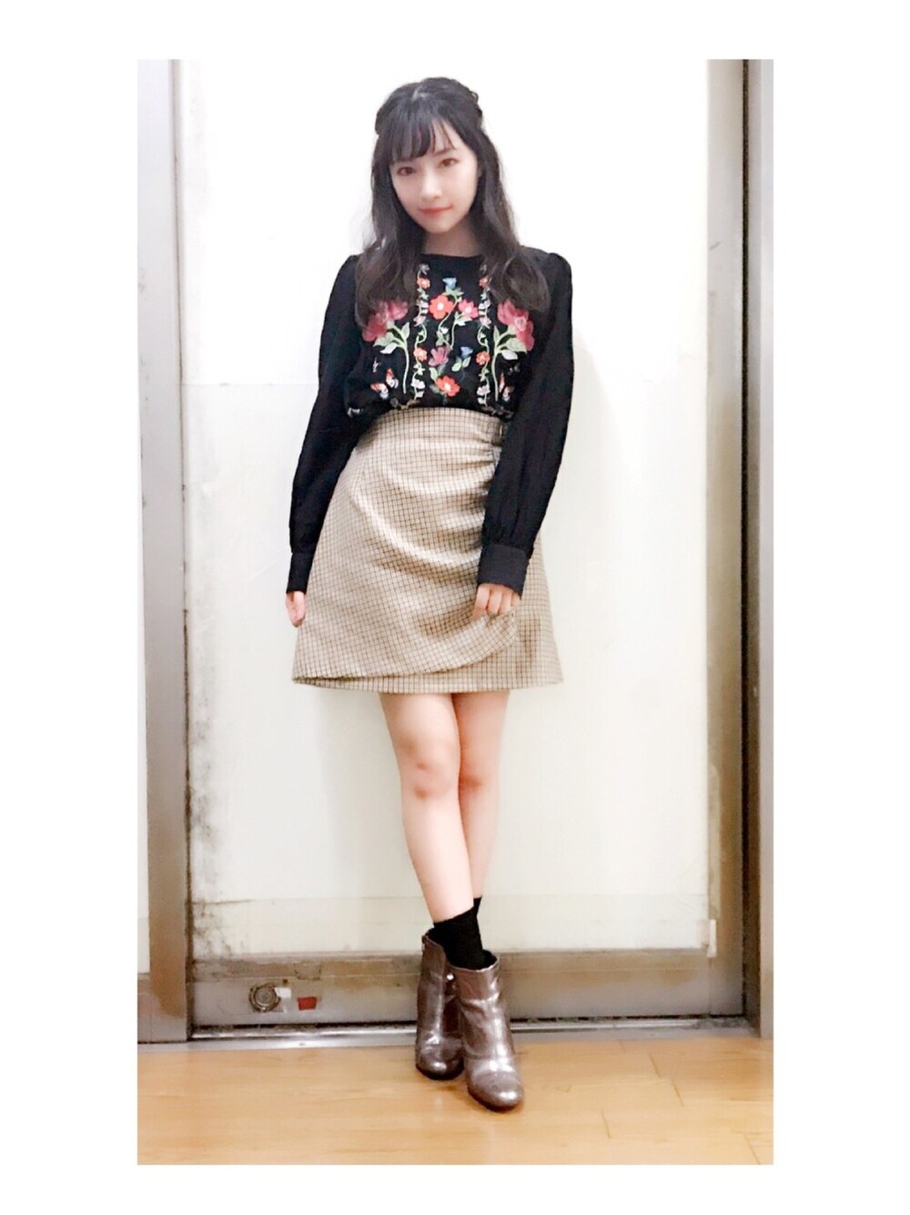 ウォッチありがとうございます😊 私服👗✨ ZARAの刺繍トップス💜 チェックのラップ風スカートと ラメのショートブーツを合わせて モードな雰囲気に...🌹🌹❤︎