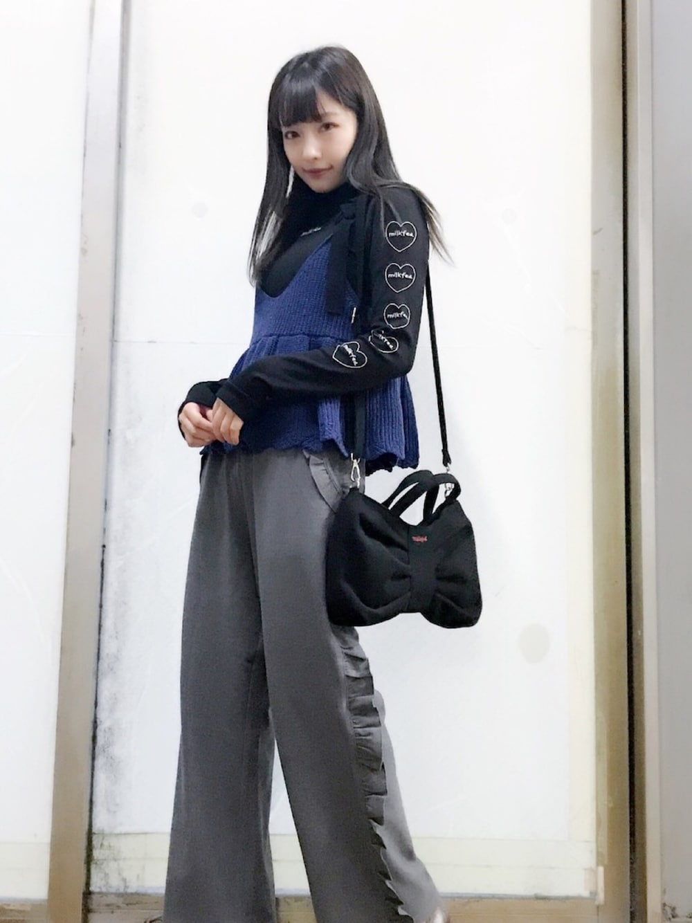 ウォッチありがとうございます😊 私服👗✨ 全身milkfed.コーデ❤︎❤︎ レイヤードにピッタリの トップスは、 ニットビスチェとあわせました💜💜 パンツのフリルも 女の子らしさ抜群だけど 落ち着いた色で挑戦しやすく 着やすい...😊💓💓