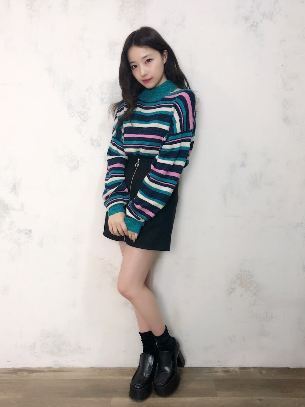 村瀬紗英のニット/セーター「ネックスラッシュラメボーダーニット」を使ったコーディネート