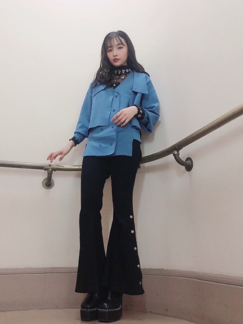 ウォッチありがとうございます^ ^ 私服👗✨ 黒×青💙🖤 フレアパンツは 足の形が綺麗に見えます^ ^ チュールの花柄トップスを レイヤードしました🖤😊