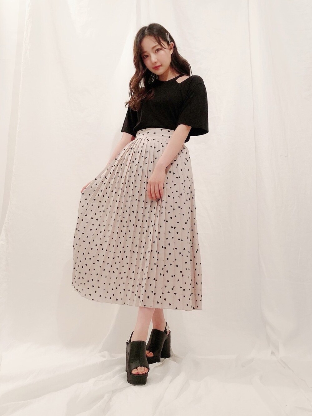 ウォッチありがとうございます😊 私服👗✨ 肩あきトップスに プリーツスカートのコーデ^ ^ プリーツスカートは ハート柄になっています!