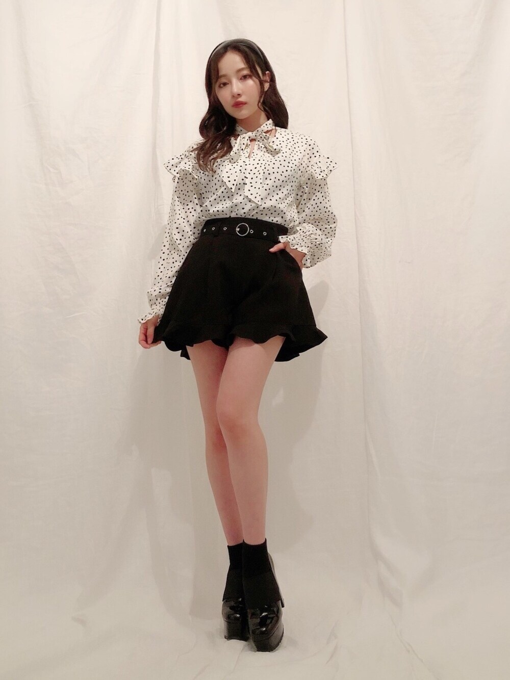 ウォッチありがとうございます😊 私服👗✨ ドットのフリルブラウス^ ^ パンツもフリルで モノトーンコーデだけど ガーリーなコーデ🖤🤍🐼