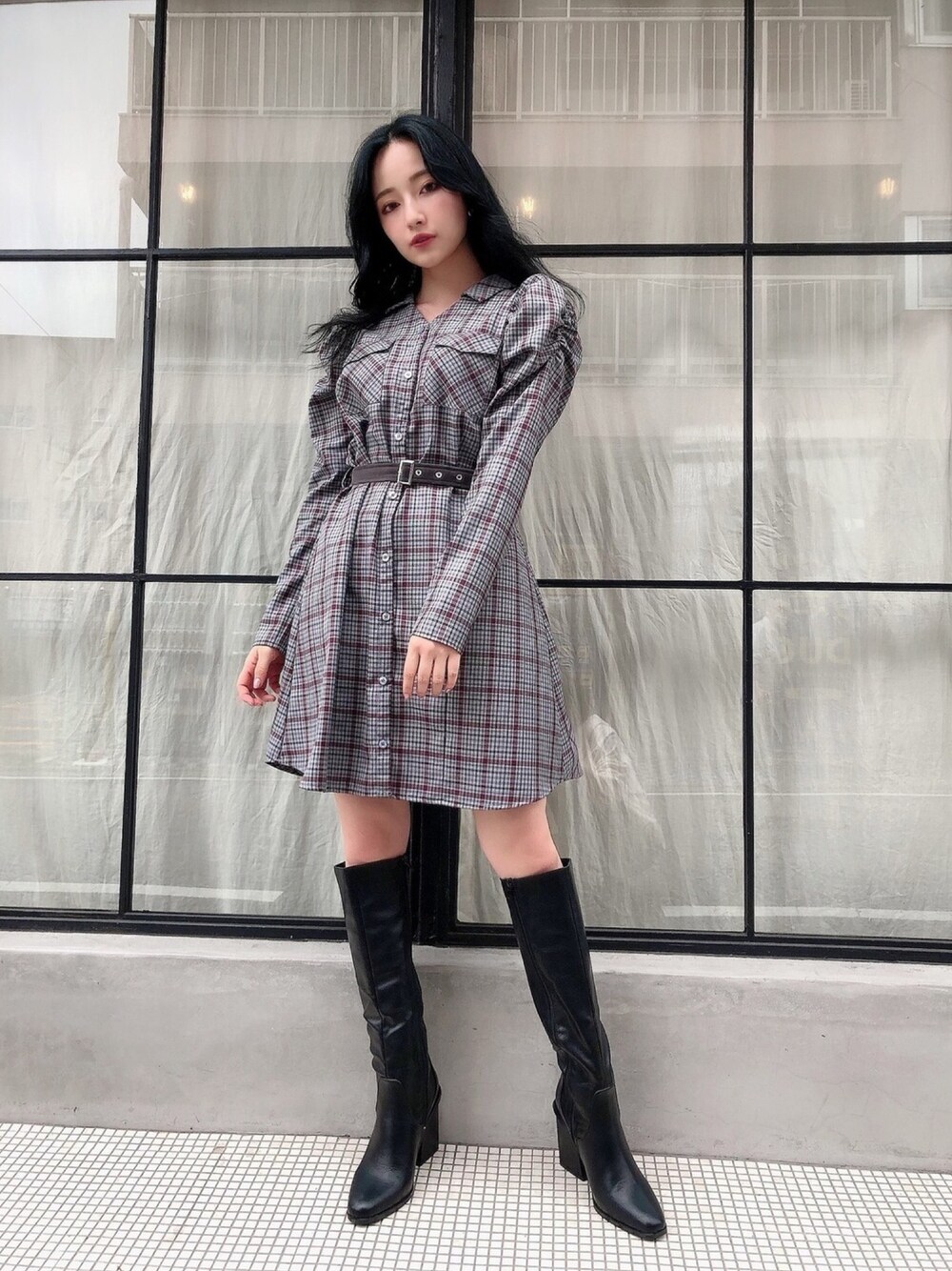 村瀬紗英のシャツワンピース「チェックシャツミニワンピ」を使ったコーディネート