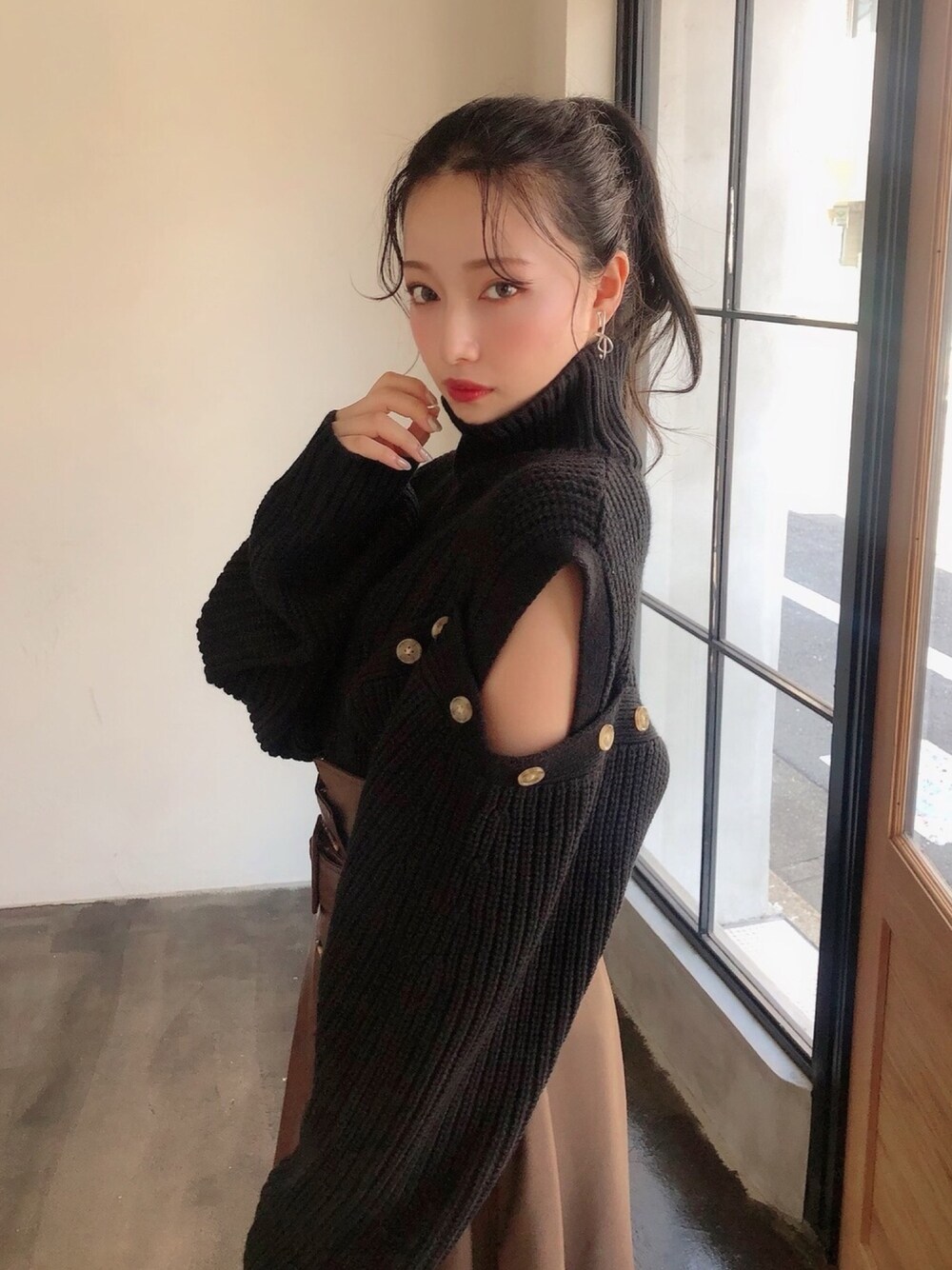 村瀬紗英のニット/セーター「オープンショルダールーズニット」を使ったコーディネート