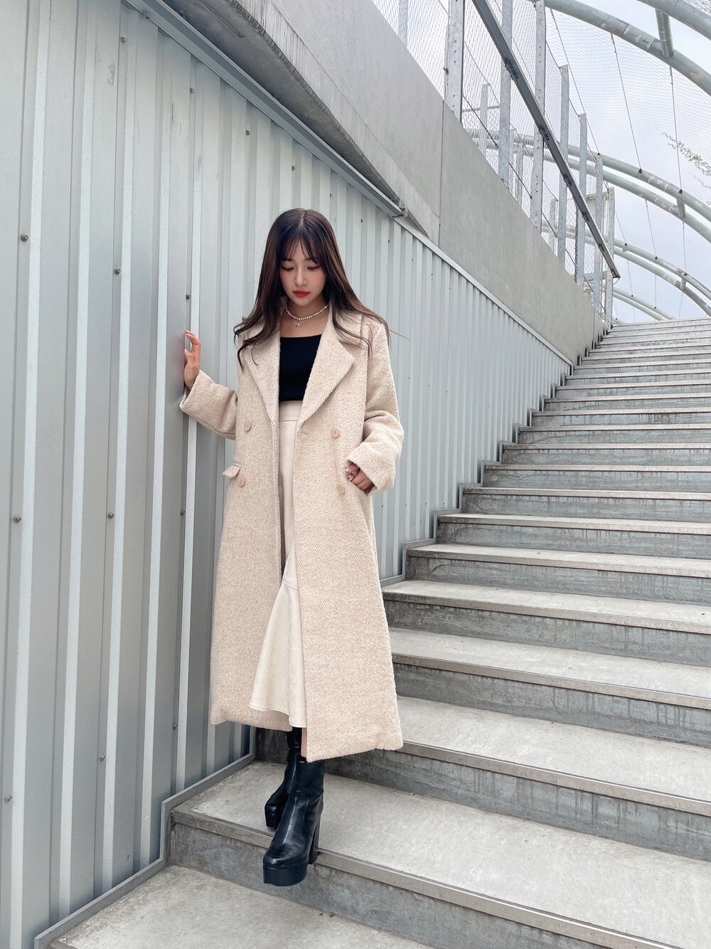 ウォッチありがとうございます😊 私服👗🤍 アイボリー系の ツイードロングコートは なかなかなくて 女性らしいコーデに1押しです🥰