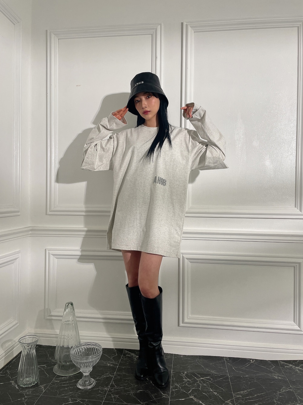 村瀬紗英のハット「フェイクレザーロゴバケットハット」を使ったコーディネート
