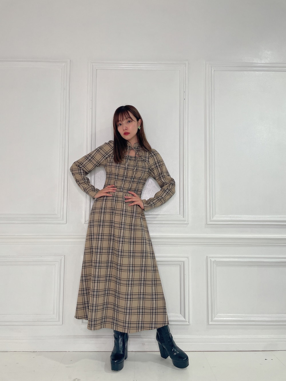 村瀬紗英のワンピース「フロントオープンチェックワンピ」を使ったコーディネート