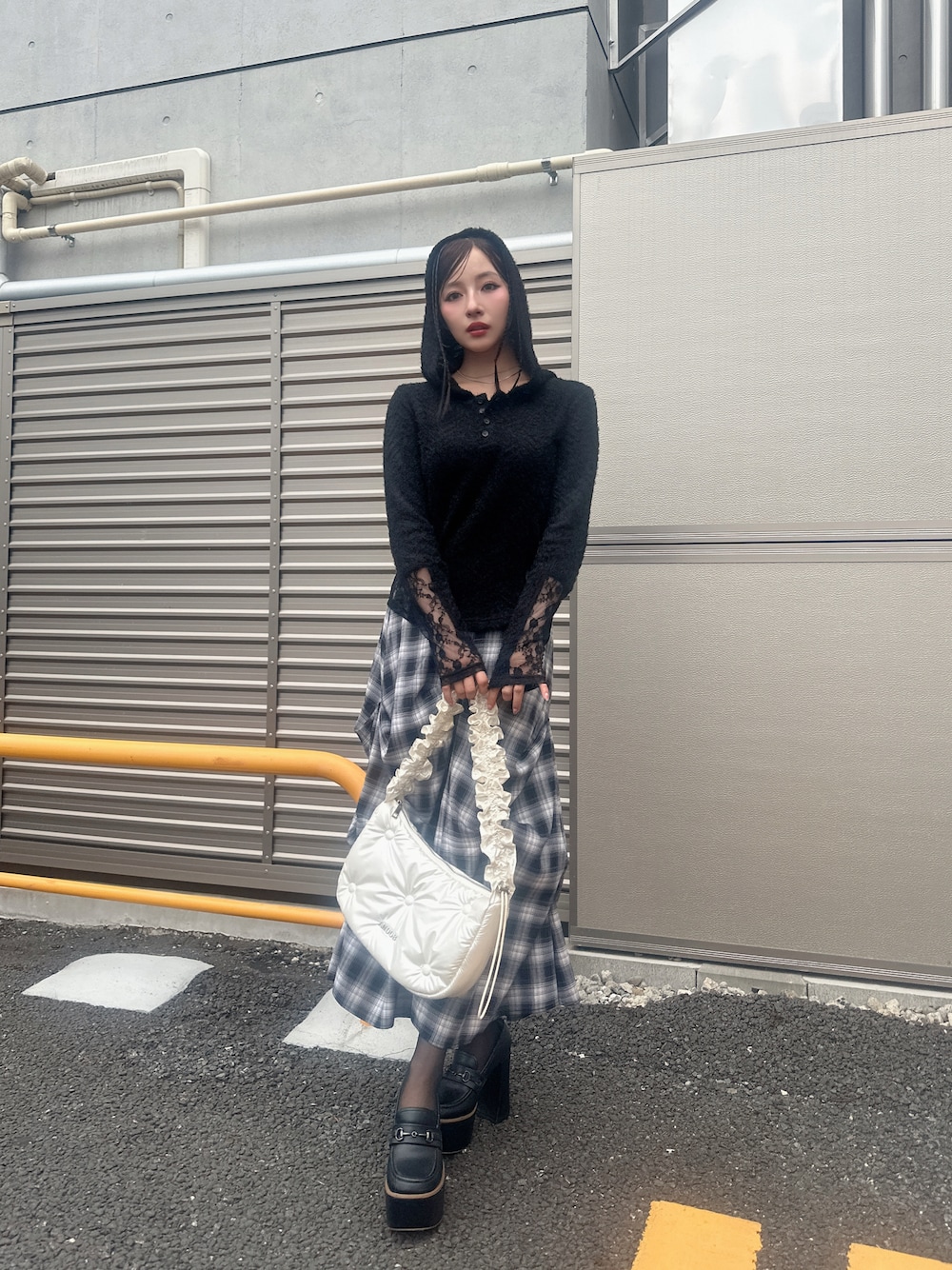 村瀬紗英のニット/セーター「ドッキングシャギーフーディー」を使ったコーディネート
