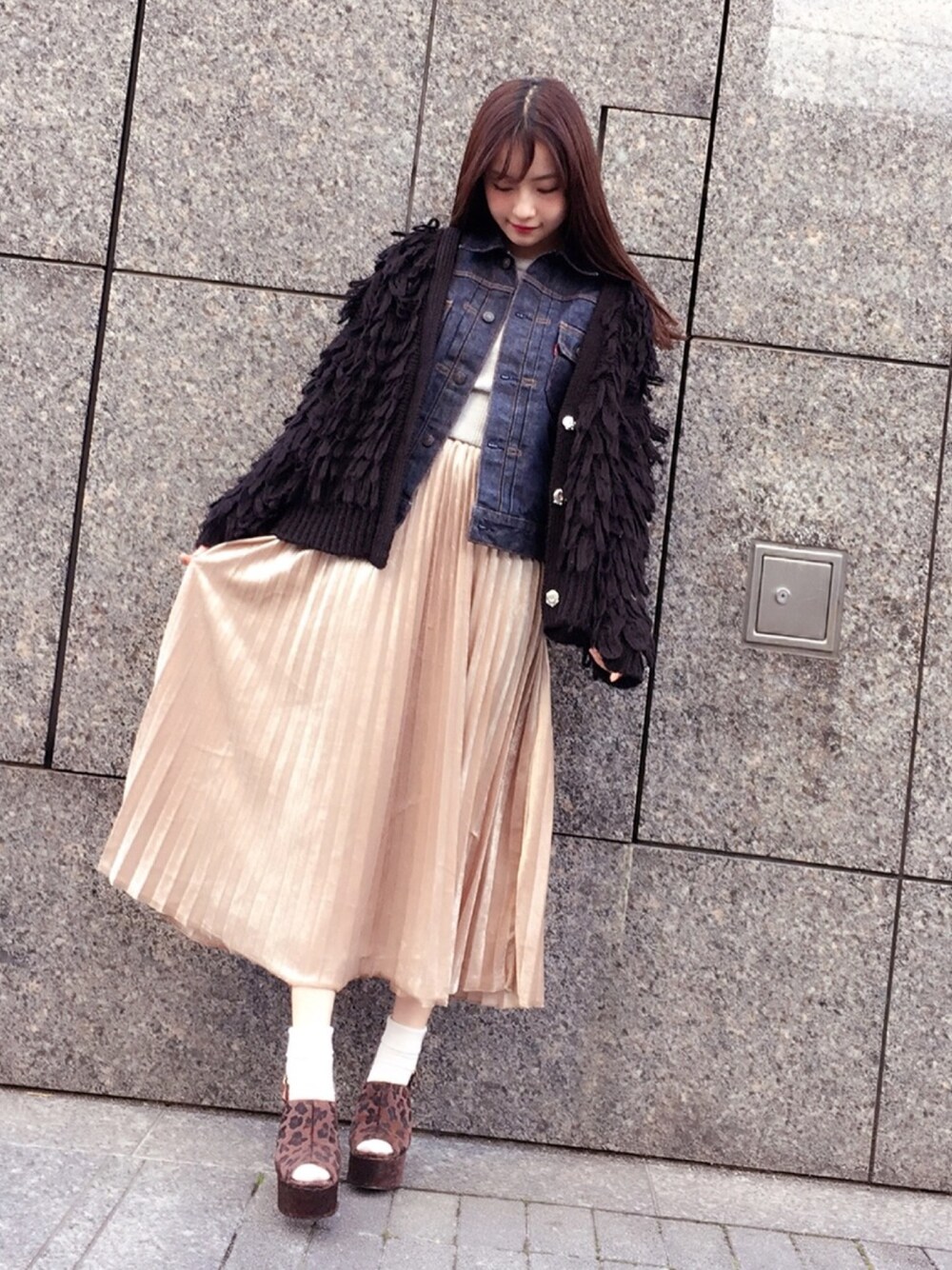ウォッチありがとうございます👀💓 私服👗✨ デニムにモンスターカーディガンを 羽織ったコーディネート😊💭 ベロアのプリーツスカートが カジュアルさをダウンさせてくれて、 大人なコーディネートに😊 写真は見えやすくしてるけど、 デニムも肩を落として着ると さらに抜け感も出ます、、、😳💜