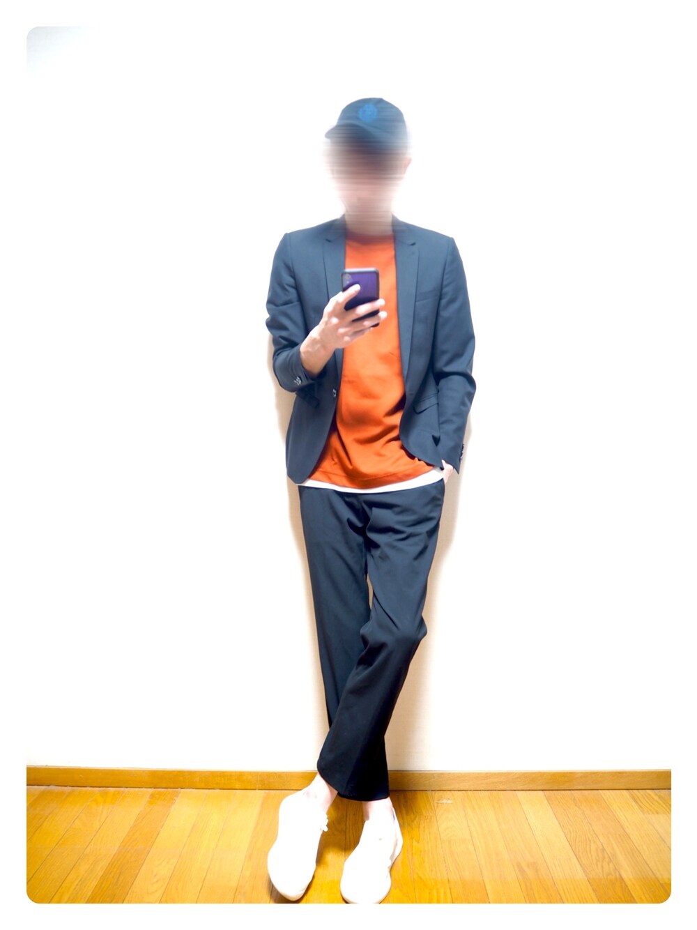 セットアップ風コーディネート別バージョン ありきたりな白Tシャツを派手目な色のTシャツに変えてあげることで差別化してます。 それでもコーディネートの中に白があった方が 清潔感が増すと思うので Tシャツの下からレイヤードで白を見せてます。 更に追加で キャップを被って セットアップコーデのドレス感を抑え目にしてます。