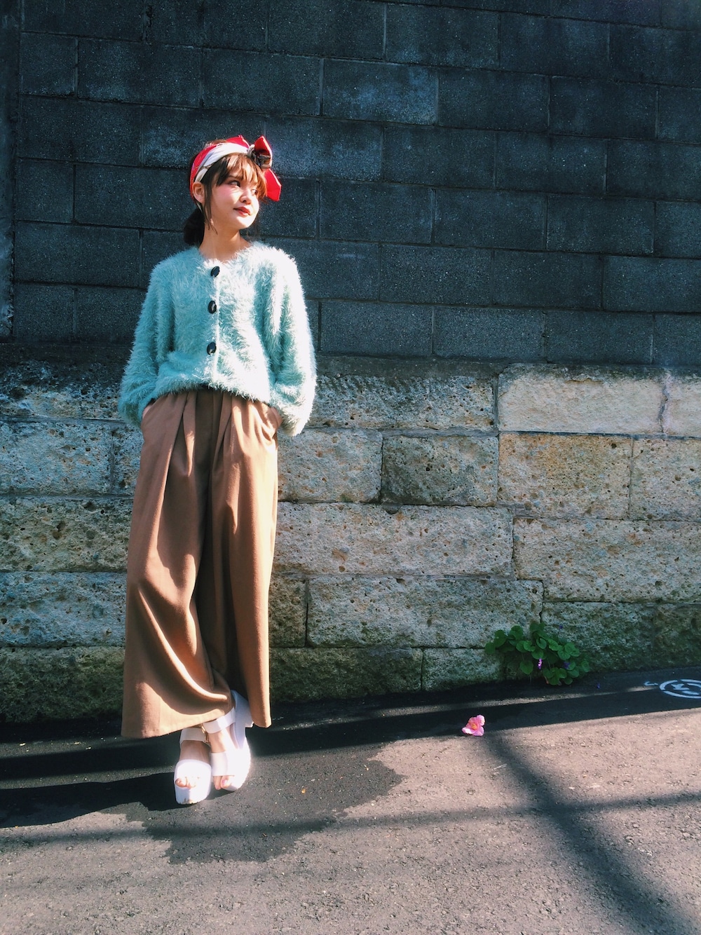 スカーフをあたまにグルグル巻くのが、まいぶーむ。 ゆるっとパンツでフェミニンな感じな日。