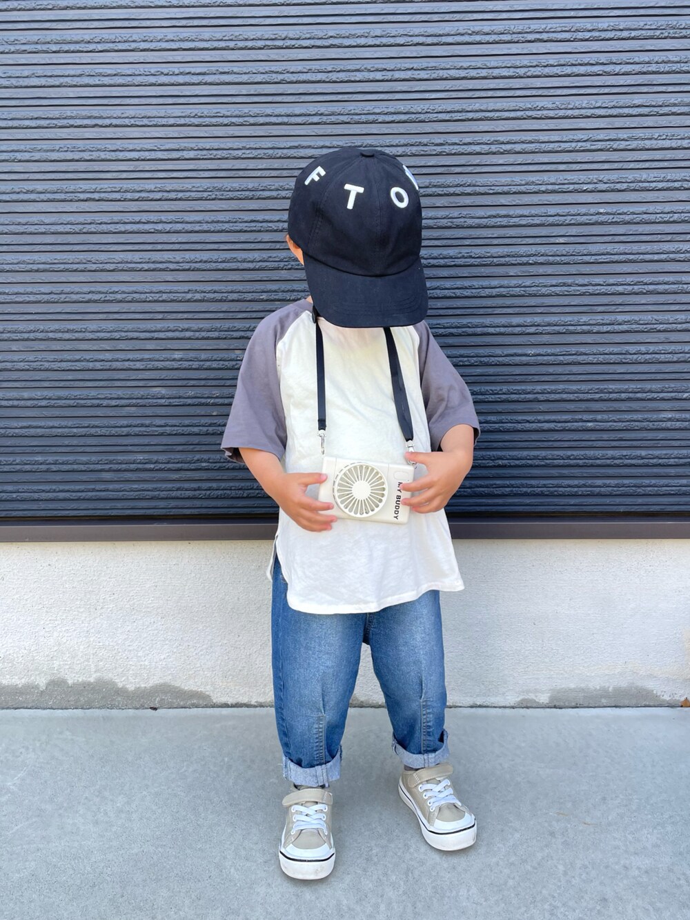 𓂃◌𓈒𓐍 b.roomのラグランTで シンプルコーデ🖤 これからの季節に大活躍の モバイルファンとともに🫠🍃 カメラみたいで可愛い🥰📸 気に入ってめっちゃスイッチ触りまくり😮💨 この日朝は肌寒かったので カーディガン着せました(4.5枚目) #保育園コーデ ¨̮ ¨̮ ¨̮ 本日ピックアップ掲載ありがとうございます🥹 𓂃◌𓈒𓐍 ご覧いただきありがとうございます𓆸⋆* ✮ 𝑂𝑇𝑂 ✮ ▷94cm ▶︎12.8kg ▷2y7m (R5.4.14 測定⚖️)