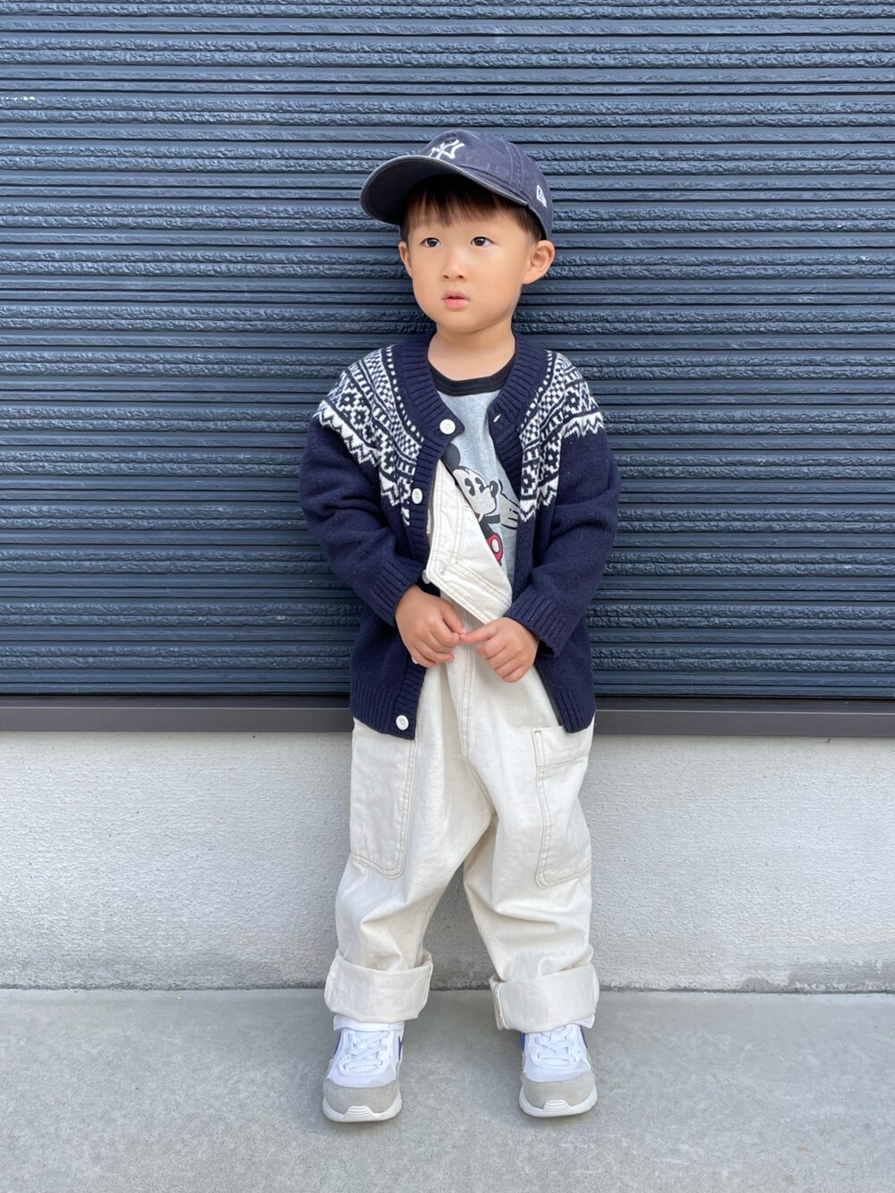 𓂃◌𓈒𓐍 ホワイトデニムサロペット🤍 UNIQLOのスフレヤーンカーディガンは 何度も登場してるけどほんと使いやすい🙆🏽♀️ 柔らかく肌触りも良いから 中が半袖でもチクチクせず着れちゃう🤭 97cmでサイズ100にしたけど 110でも良かったかな☺️ ────────── 👦 3y / 97cm / 13kg