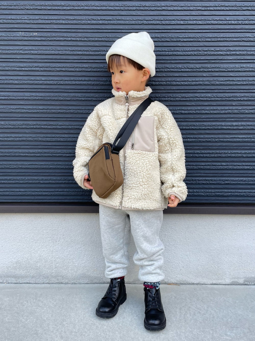 𓂃◌𓈒𓐍 防風フリースジャケット チャック全部閉めて スッキリスタイルに🐑🤍 首元までふわふわだからマフラーいらず🥹 足元は冬らしい柄のソックスを💙 ────────── 👦 3y / 98cm / 13kg