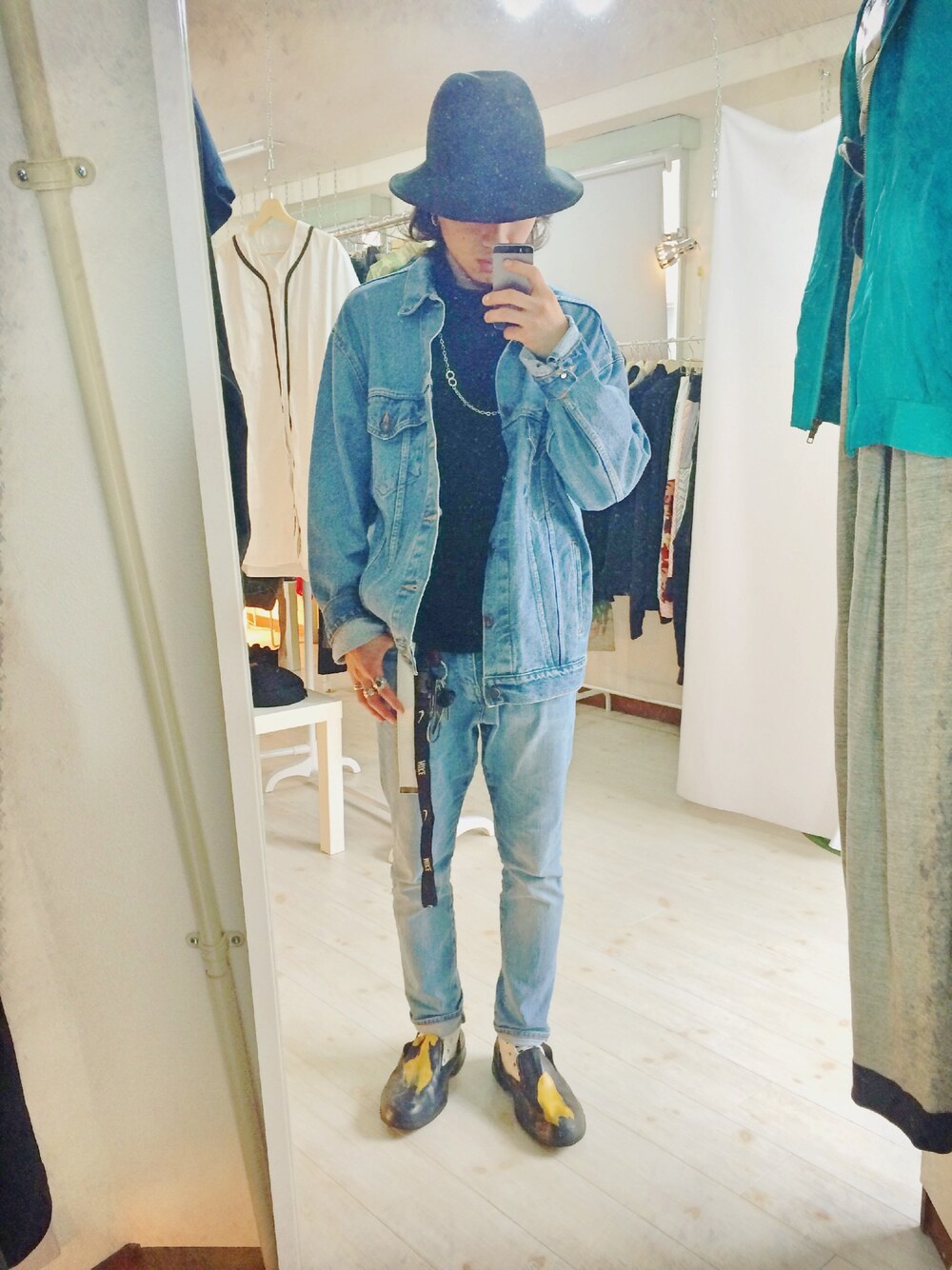デニムオンデニムにハマってます。 セットアップじゃないですけど… コンバースには米軍のデットストックのレインカバーを被せています