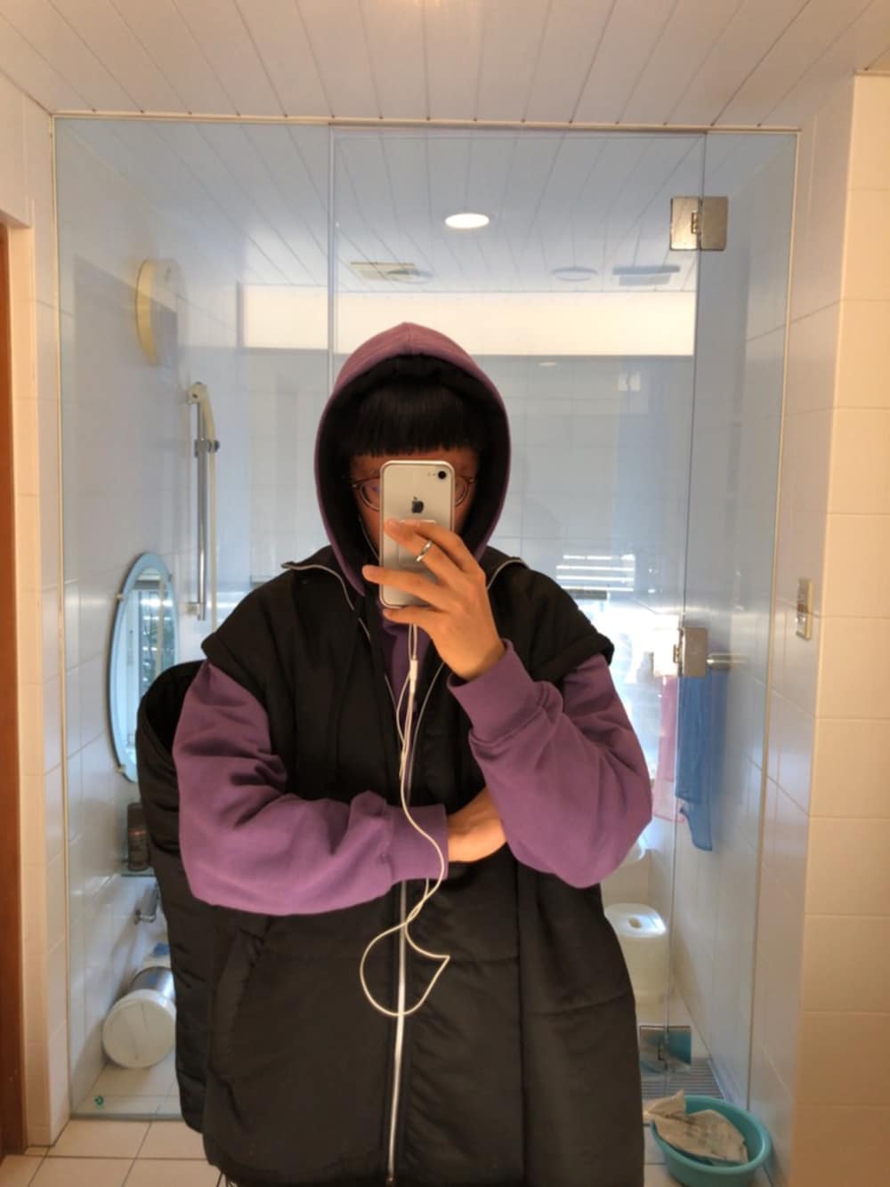 ブラック系のダウンジャケット/コート、パープル系のパーカーを着用したメンズの冬コーディネートの1枚目の写真