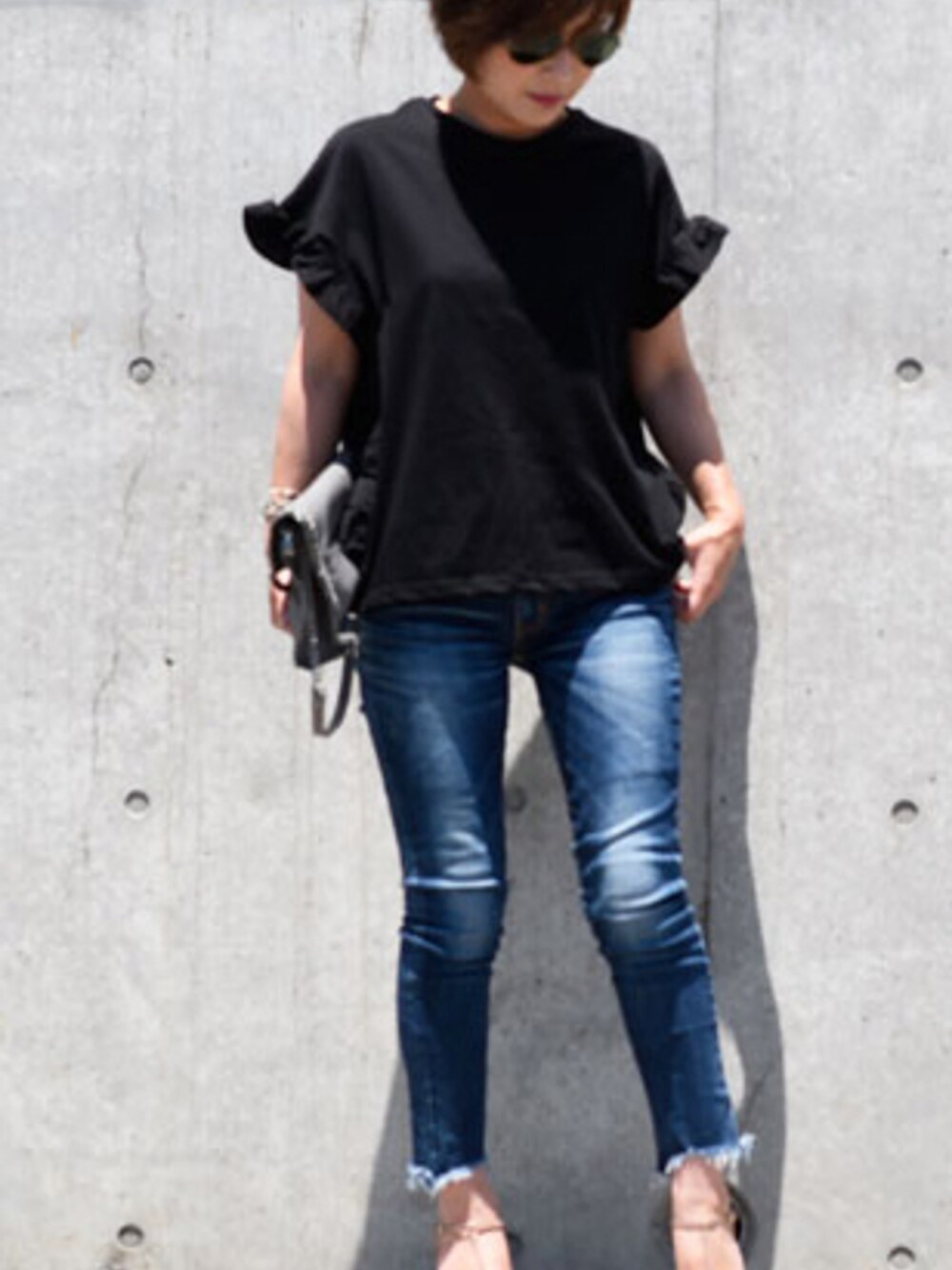 ティアードフリルのプルオーバーをカジュアルにデニムと合わせました♡ ほどよいゆとり感のあるシルエットが特徴で、あえて胸元の開いていないデザインがカジュアルにも◎ また、程よいフリルが腕を華奢に見せてくれる♪大人可愛いアイテムです