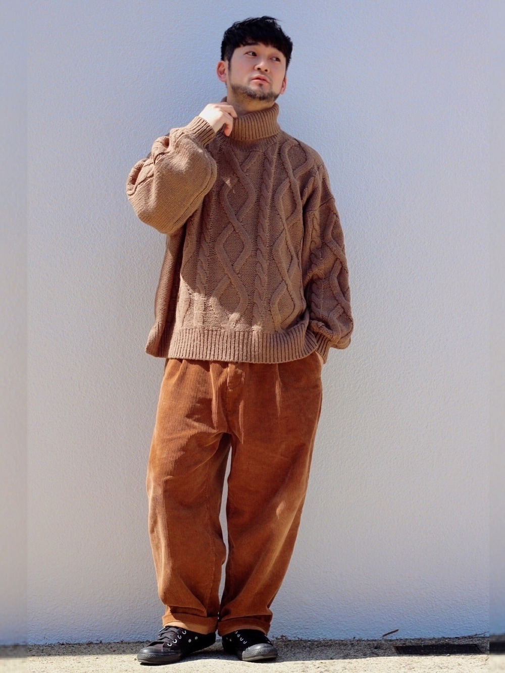 TOCHIOのニット/セーター「WEB限定 スーパービッグシルエット タートル ケーブルニット」を使ったコーディネート
