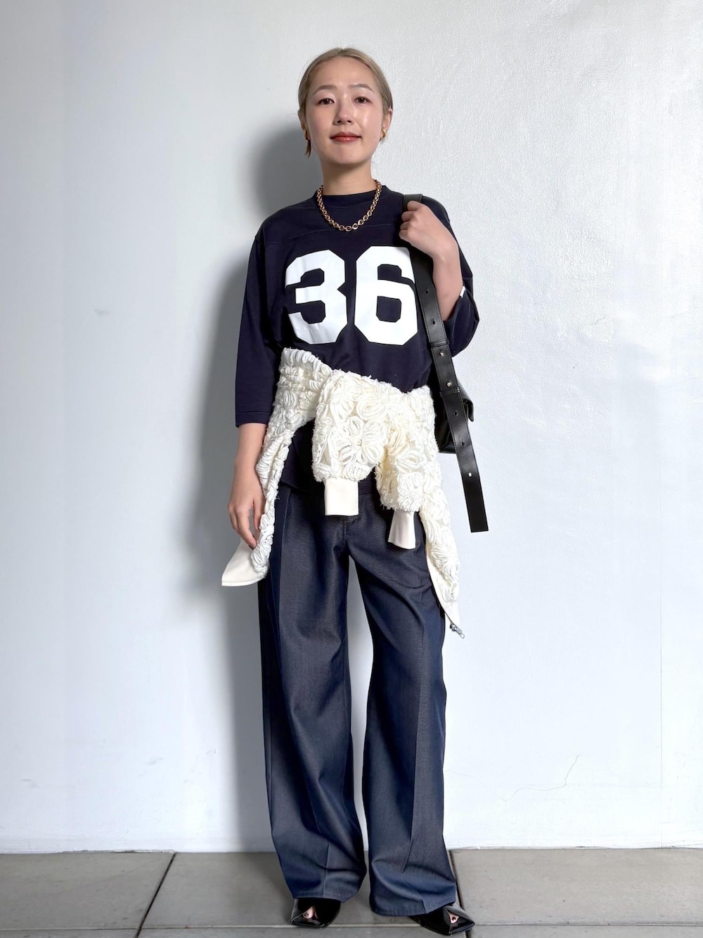 こんにちは! いつもご覧いただきありがとうございます☺︎ 本日はこれから発売予定のアイテムを合わせたスタイリングのご紹介です! ボトムは愛用しているNIKKE(ニッケ)のパンツ。 こちらも入荷予定のレースブルゾンを腰に巻いてアクセントにしてみました♪