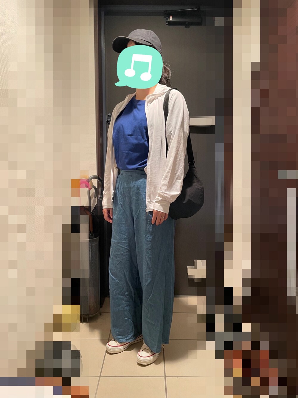見ていただきありがとうございます☆ 今回は、最近のワンマイルコーデです! 久々にワンマイルコーデを撮ってみました。 今年はUVカットのメッシュパーカーを買ったので、ちょっとしたスーパーや自転車の時はこれとキャップで紫外線対策してます! でもそろそろ暑い🥵 中はカラーTシャツとワイドパンツでブルーのグラデーションに。 トップスは5/31に着たグリーンの色違いです。 この日気付いたのですが、カラーTシャツは汗染みが目立ちますね💦 パーカー着ていたのでセーフでしたが、これからはちゃんと対策していこうと勉強になりました✏️