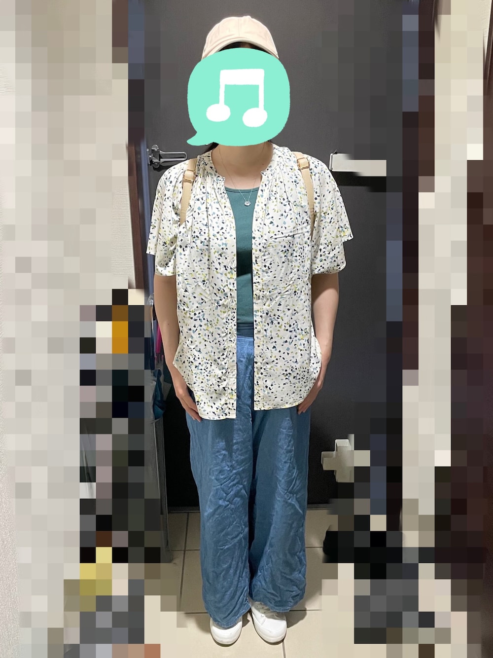 見ていただきありがとうございます☆ 今回は、ショッピングコーデです! 天気→晴れ時々曇り🌤️ 最高気温→37℃ 午前中から夜までショッピングモールへ。 ブラウスの柄の色に合わせて、グリーンのタンクトップとデニムワイドパンツを合わせました。 歩くので靴はスニーカー、日差し対策でキャップと折り畳み日傘を使いました。
