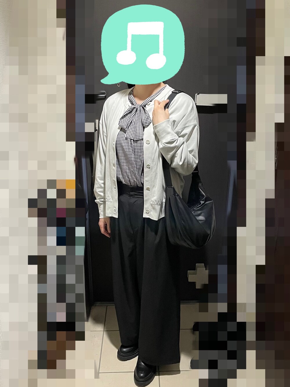 見ていただきありがとうございます☆ 今回は、モノトーンコーデです! 午後から夜まで出かけました。 久々のパンツ。ポリエステルで乾きやすい! 寒かったのでチェックのブラウスとカーディガンを合わせました。 GUのブーツが大雨には最強です✨
