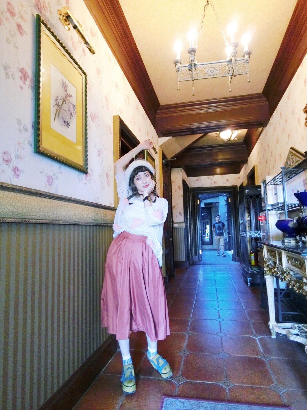 ピンク系のトップス、レッド系のネックレスを着用したレディースの秋コーディネートの1枚目の写真
