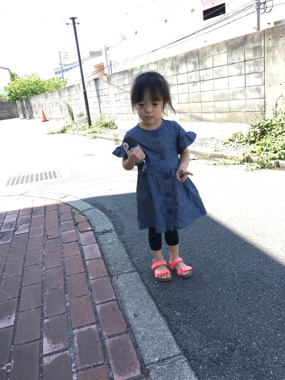 なんか困った顔してる…(笑) 雨上がりで急に暑くなったので、今年初のサンダル☆もうサイズアウトかなと思って履かせたら、まだ全然大丈夫だった(¯―¯٥)昨年、友人からお下がりで頂いた、蛍光オレンジのサンダル(*´艸`*)派手カワ♡