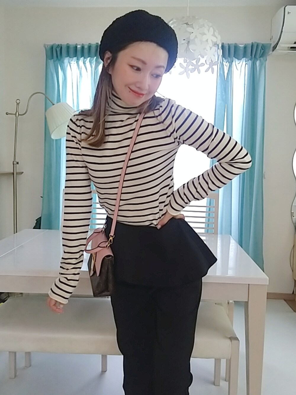 ペプラムパンツ♡ お尻周りをお洒落にカバーできます♡ とってもお洒落なデザインです🥰 ボーダートップスも 柔らかな生地でおすすめです♡