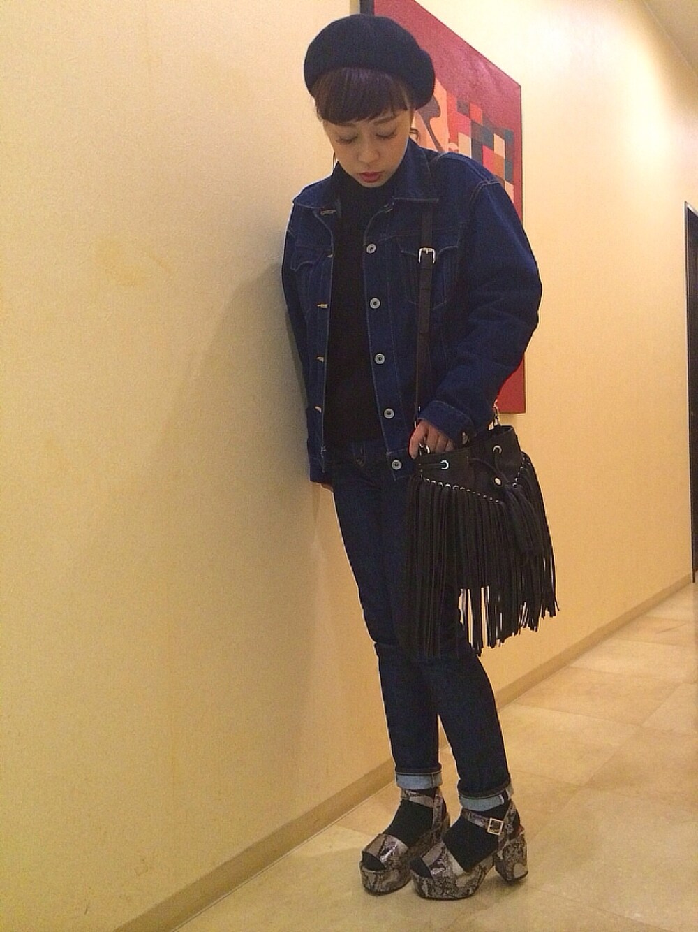 ワンウォッシュデニムに赤リップで秋らしくね