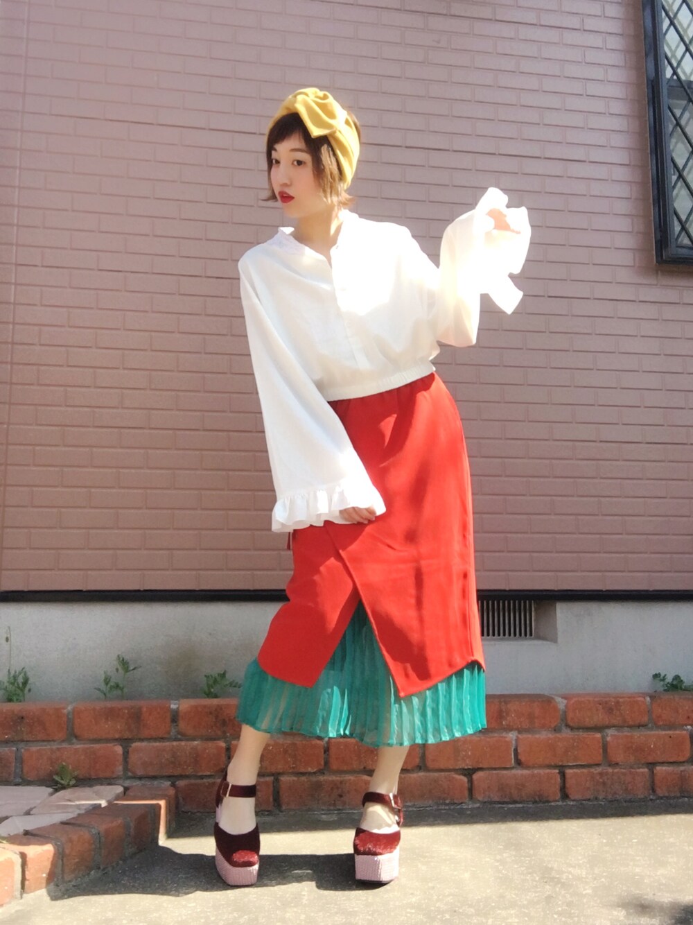 先ほどのコーデに、 カオリノモリリーリエターバンを ぷらす! これでチューリップ色コーデ 完成。 赤❤️白♡黄色💛