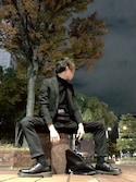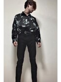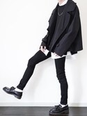 黒コーデ。柄シャツ。高架下の人。