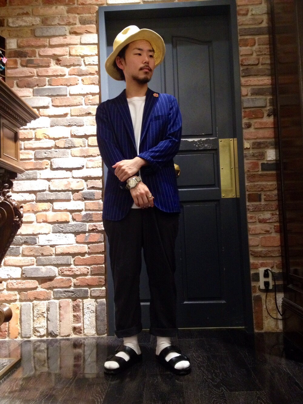 ジャケット nano・universe カット Champion パンツ BASIS BROEK サンダル BIRKENSTOCK ハット BRONTE