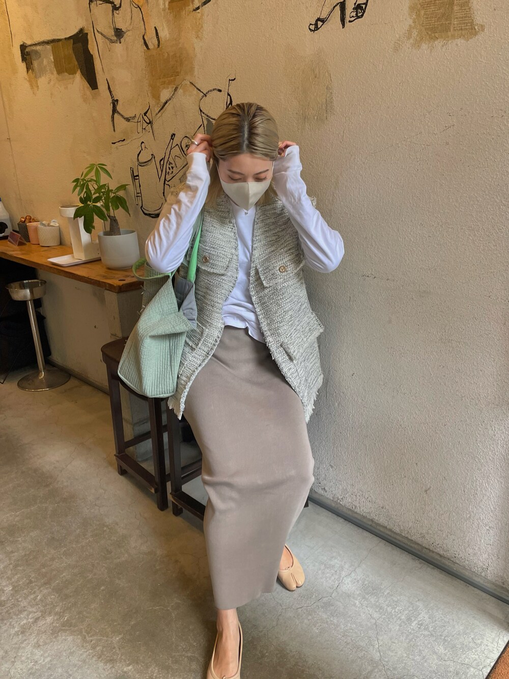 シルエットが綺麗な上に 程良く肉厚な生地で下着のラインも拾わず、少しゆとりもあってうごきやすいと色々配慮されたtwomelのタイトスカートをメインにペールトーンで🤍
