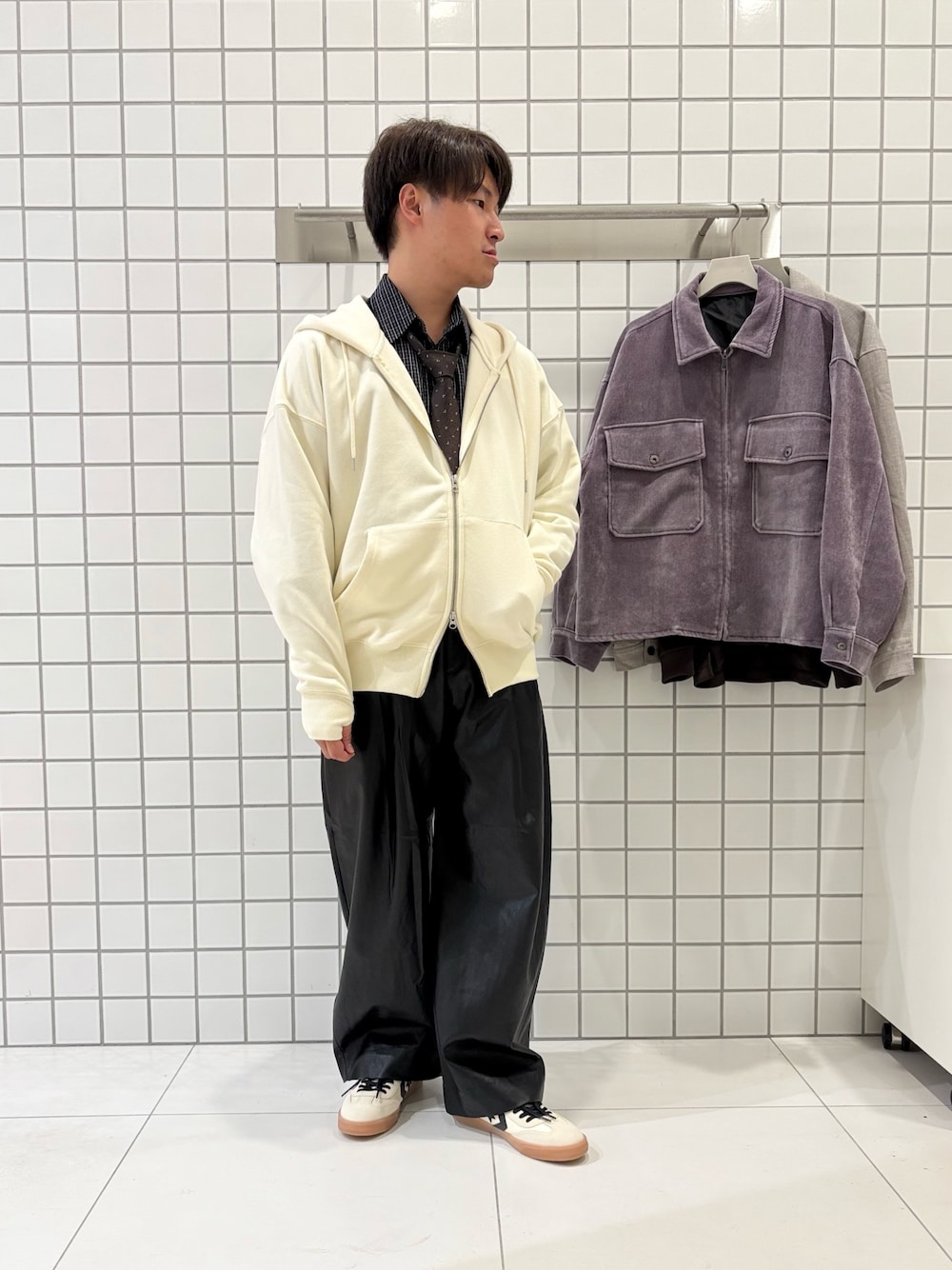 ダブルジップと短丈でトレンド感のあるジップパーカー! 太めのカーブパンツと合わせてスタイルアップ! チェックシャツ×ネクタイの合わせで古着風のスタイリングに仕上げました!