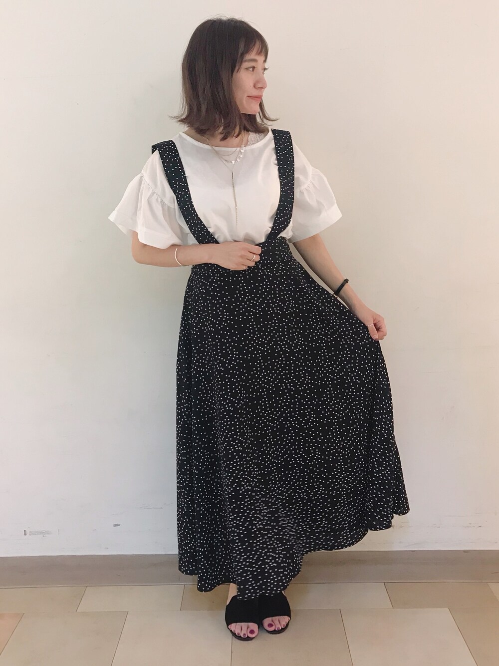 ドットのサロペットスカートは長めの丈なので今年らしくておススメです🌼 丈は2段階調整できて、もう1段短くすることも可能です🙆♀️