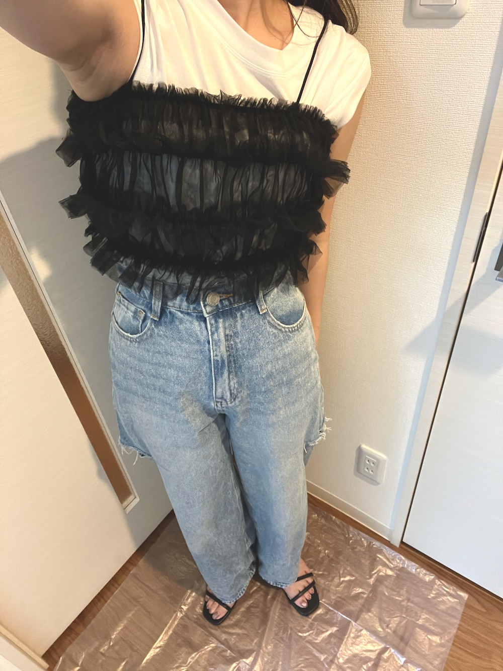 muuu95のデニムパンツ「[販売枚数3.4万枚突破][お気に入り登録数4.3万][低身長/高身長サイズ有]サイドスリットワイドストレートコットンデニムパンツ」を使ったコーディネート