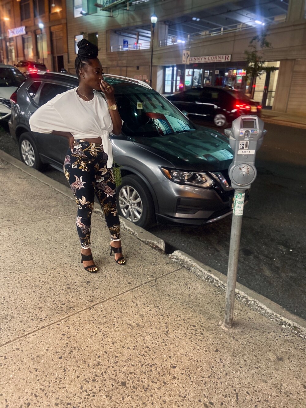 ブラック系のサンダルを着用したレディースの夏コーディネートの1枚目の写真