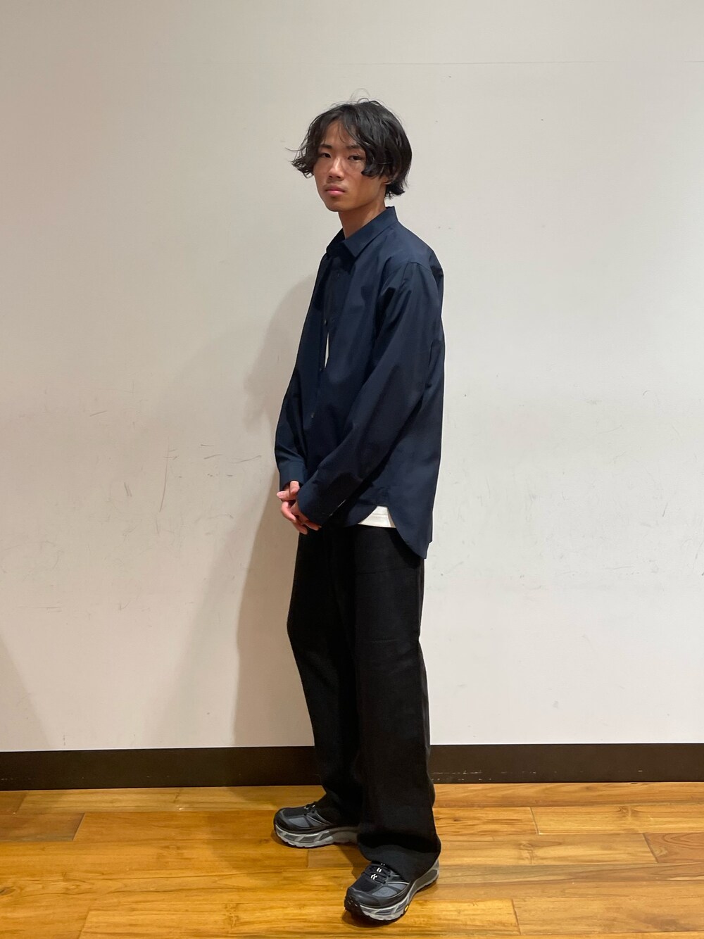シンプルながらスニーカーにデザイン性のあるものを持ってきてアクセントを加えています。