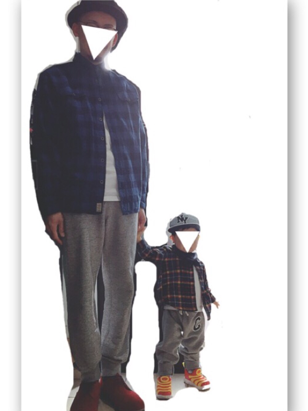 お久しぶりです! 息子の格好に寄せた結果、こうなりました笑 ちなみに、この日は妻もシャツ×グレースウェットでした笑