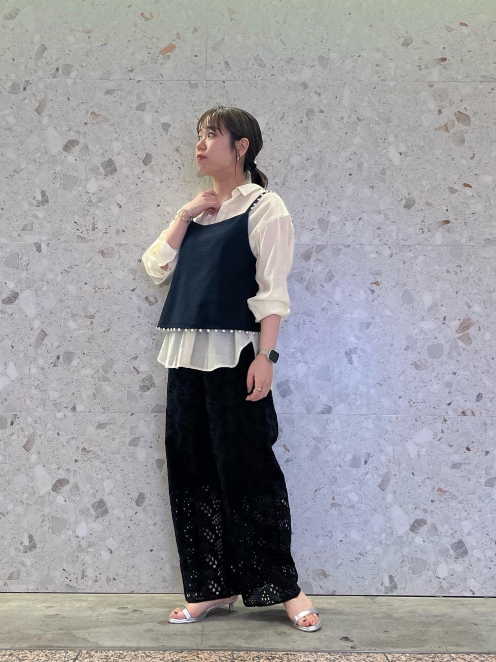 20代後半/158cm/骨格ストレート/普段サイズM/着用サイズ トップス38ボトム38 【楊柳シアーオーバーシャツ】 サイズ感: 全体的にオーバーサイズ。腰回りが隠れる丈感です。 素材感: 程よく透け感のあるサラッとした素材。 着用感: とても軽く涼しげな着心地です。初夏の羽織りにもおすすめです◎ 【パールツキキャミブラウス】 サイズ感 : 窮屈感は感じない程度に程よくコンパクトなサイズ感。 素材感: サラッとした麻混素材。 着用感: 着るだけで着映えます。インナー次第で長く着回せます◎ 【Fanaka カットワークレースパンツ】 サイズ感: 全体的にゆとりがあります。ウエストは紐で調整可能なのでぴったりです。 素材感: 程よくハリのある綿素材。 着用感: 軽くてゆったりしているので着心地も楽です。