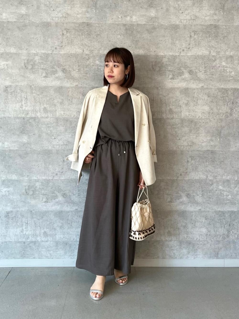 20代後半/158cm/骨格ストレート/普段サイズM/着用サイズ トップス38ボトム38 【麻クロステーラードジャケット】 サイズ感: 全体的にゆとりがあります。腰回りが隠れる丈感。 素材感: 軽くサラッとした麻混素材。 着用感: 素材も柔らかいので着心地も楽です。初夏まで着回しやすいです◎ 【リネンライクオールインワン】 サイズ感 : 全体的にゆとりがありますが、ウエストはゴムが入っているので腰でとまります。 素材感: サラッとドライタッチな素材感。 着用感: 落ち感のある素材でスッキリ見えます。体のラインを拾わない程度にゆとりがあります。