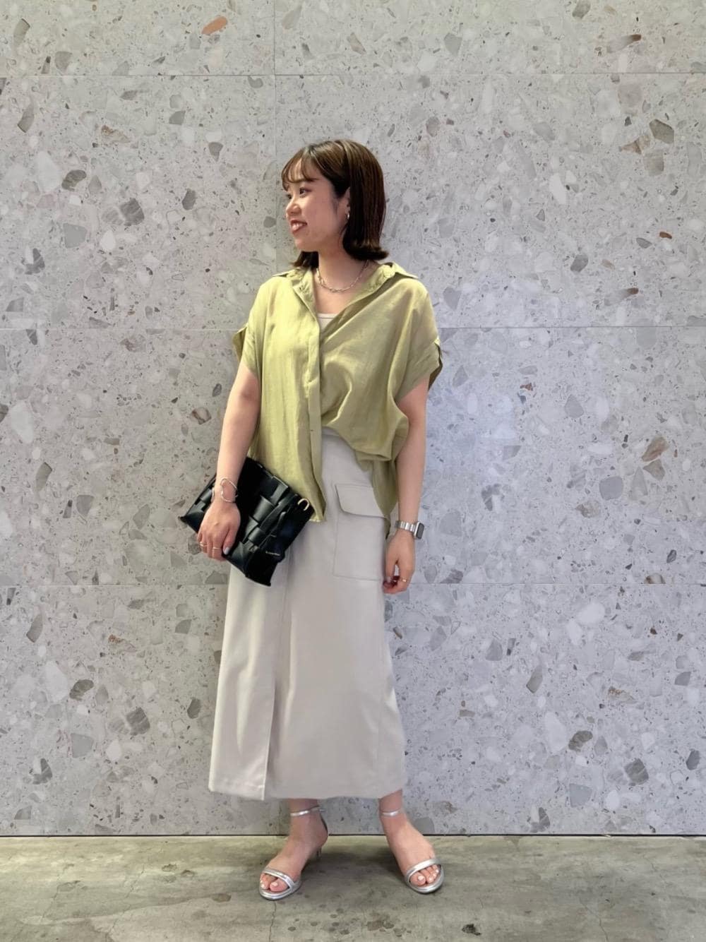 20代後半/158cm/骨格ストレート/普段サイズM/着用サイズ トップス38ボトム38 【シアースリーブタックブラウス】 サイズ感:全体的にゆとりがあります。腰回りが隠れる丈感。 素材感: 程よい透け感のサラッとなめらかな素材。 着用感: 袖口にデザインがあり二の腕もカバーしてくれます。前開きなので羽織りにもおすすめです◎ 【ドライタッチカーゴポケットトラペーズスカート】 サイズ感 : 腰回りスッキリめ。ウエストは後ろのゴムが柔らかくフィットします。 素材感: ストレッチの効いたサラッとした素材感。 着用感: 前スリットで歩きやすいです。丈も長すぎずスッキリした印象になります。