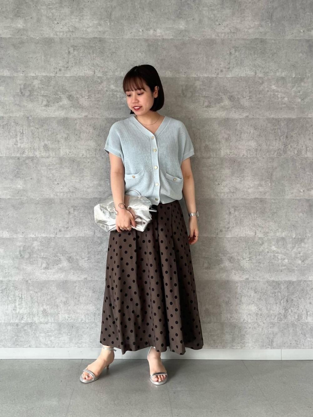20代後半/158cm/骨格ストレート/普段サイズM/着用サイズ トップス38ボトム38 【ペーパーヤーンニットベスト】 サイズ感: 丈感はコンパクトめ。身幅にはゆとりがあります。 素材感: ドライタッチなニット素材。 着用感: フレンチスリーブで二の腕も程よくカバーしてくれます。ゴールドボタンが上品な印象です。 【ドットフロントタックロングスカート】 サイズ感 : ウエストはバックゴムなので少しゆとりがあります。 素材感: 柔らかくドライタッチな肌触りの麻混素材。 着用感: 裾に向かって程よく広がるフレアシルエットがスッキリ見せてくれます。