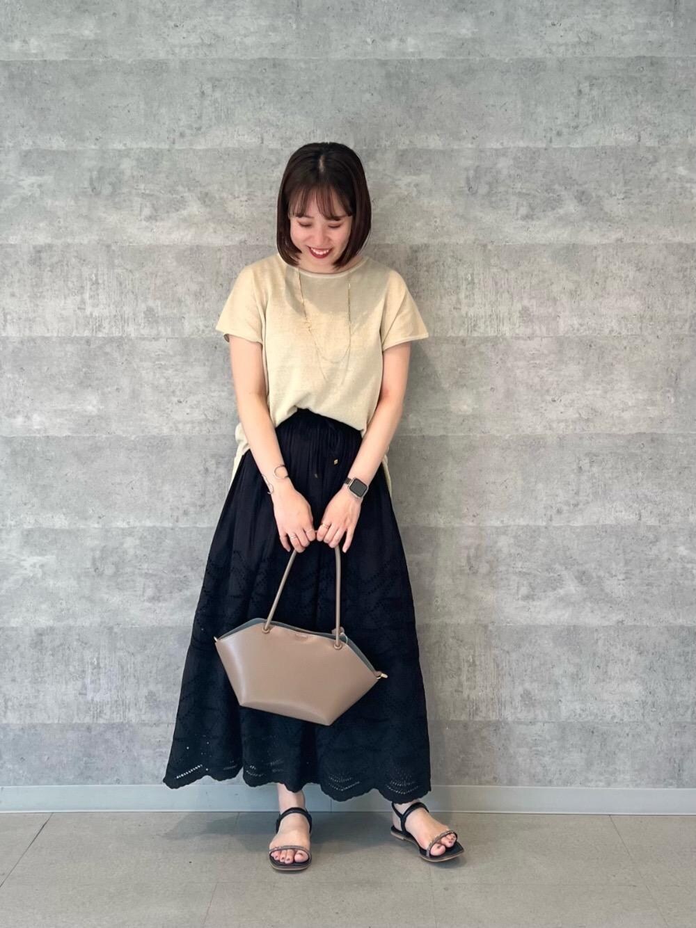 20代後半/158cm/骨格ストレート/普段サイズM/着用サイズ トップス38ボトム38 【ラメフレンチスリーブニット】 サイズ感 : 体のラインが目立たない程度のゆとりがあります。腰回りが隠れる丈感。 素材感: 薄手でサラッとした涼しげなニット素材。 着用感: 二の腕もカバーしてくれて1枚で着ていただきやすいです。程よいラメのキラッと感が着映えます。 【カットワークレースギャザースカート】 サイズ感: ウエストはゴムで丁度いいサイズ感。 素材感: 程よくハリのある綿素材。 着用感: 広がりすぎない程よいフレアシルエットで甘すぎず大人なスカートです。