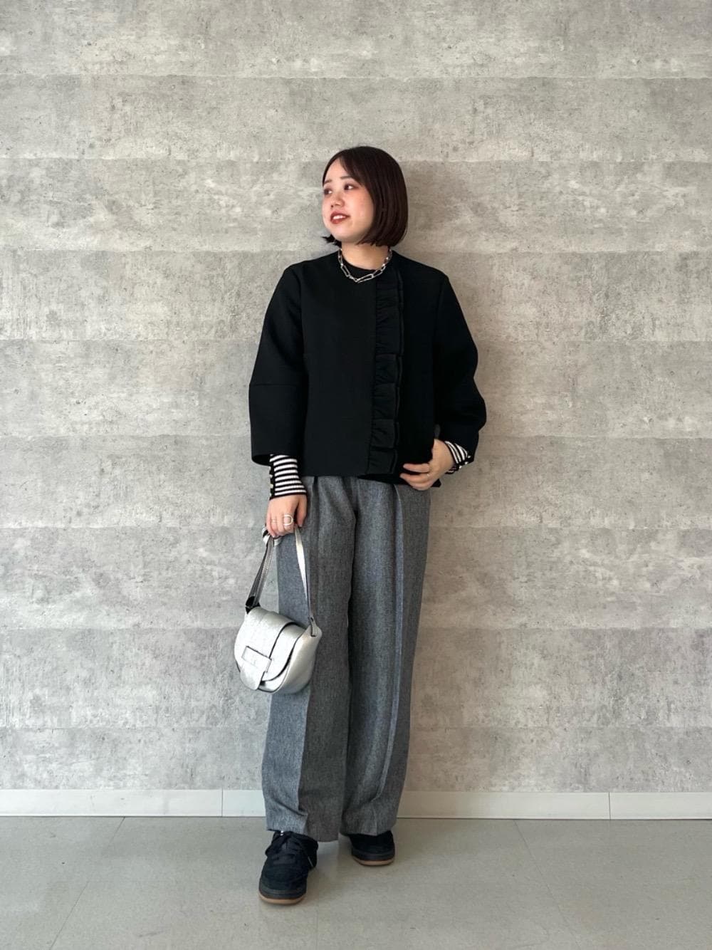 20代後半/158cm/骨格ストレート/普段サイズM/着用サイズ トップス38ボトム38 【コンパクトリブニット】 サイズ感 : 程よくコンパクトめ。 素材感: 伸縮性があり柔らかいニット素材。 着用感: 窮屈感はあまりなく楽な着心地です。袖のゴールドボタンがさりげないワンポイントに。 【Perle Pecheフロントフリルノーカラージャケット】 サイズ感 : 程よいゆとりがあります。丈は長すぎずボトムを選ばず合わせやすいです。 素材感: 程よい厚みのさらっとした素材感。 着用感: 軽くてゆとりがあるので動きやすいです。前のフリルに存在感があり着映えます。 【ヘリンボーンタックワイドパンツ】 サイズ感 : 38サイズでウエストはすっきりめ。ヒップにはゆとりがあります。 素材感: 柔らかくシワの気にならない素材感。 着用感: きれいめからカジュアルまで合わせやすいデザイン。ウエストはベルトで調整できるのも嬉しいポイント◎