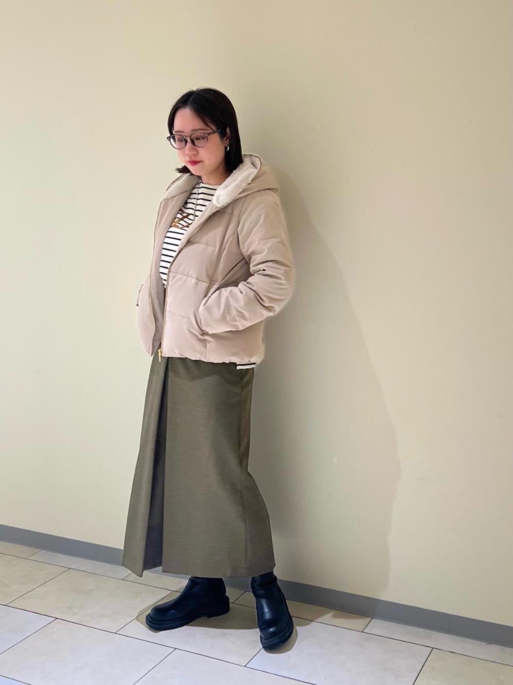 20代後半/158cm/骨格ストレート/普段サイズM/着用サイズ トップス38ボトム38 【GLACE スパンコールロゴボーダー】 サイズ感 : 全体的にゆったりめ。ヒップにかかるぐらいの丈感。 素材感: 薄手ですがハリのある素材感。 着用感: スパンコールが華やかでアウターの中でも着映えてくれます。 【ボックスタックロングスカート】 サイズ感 : 38サイズ着用でウエストはゆとりがあります。足首が見える丈感。 素材感: 程よくハリのあるしわが気になりにくい素材感。 着用感: 広がりすぎずスッキリしたシルエットでボリュームのあるトップスとも合わせやすいです。 【ファーフードショートダウン】 サイズ感 : 38サイズ着用で身幅と腕周りは少しゆとりがあります。腰回りにかかるぐらいの丈感。 素材感: 表面はマットな質感。柔らかくてとても軽いです。 着用感: 着膨れ感も感じにくくスカートでも合わせやすいです。軽くてあまり着込まなくても暖かいです。
